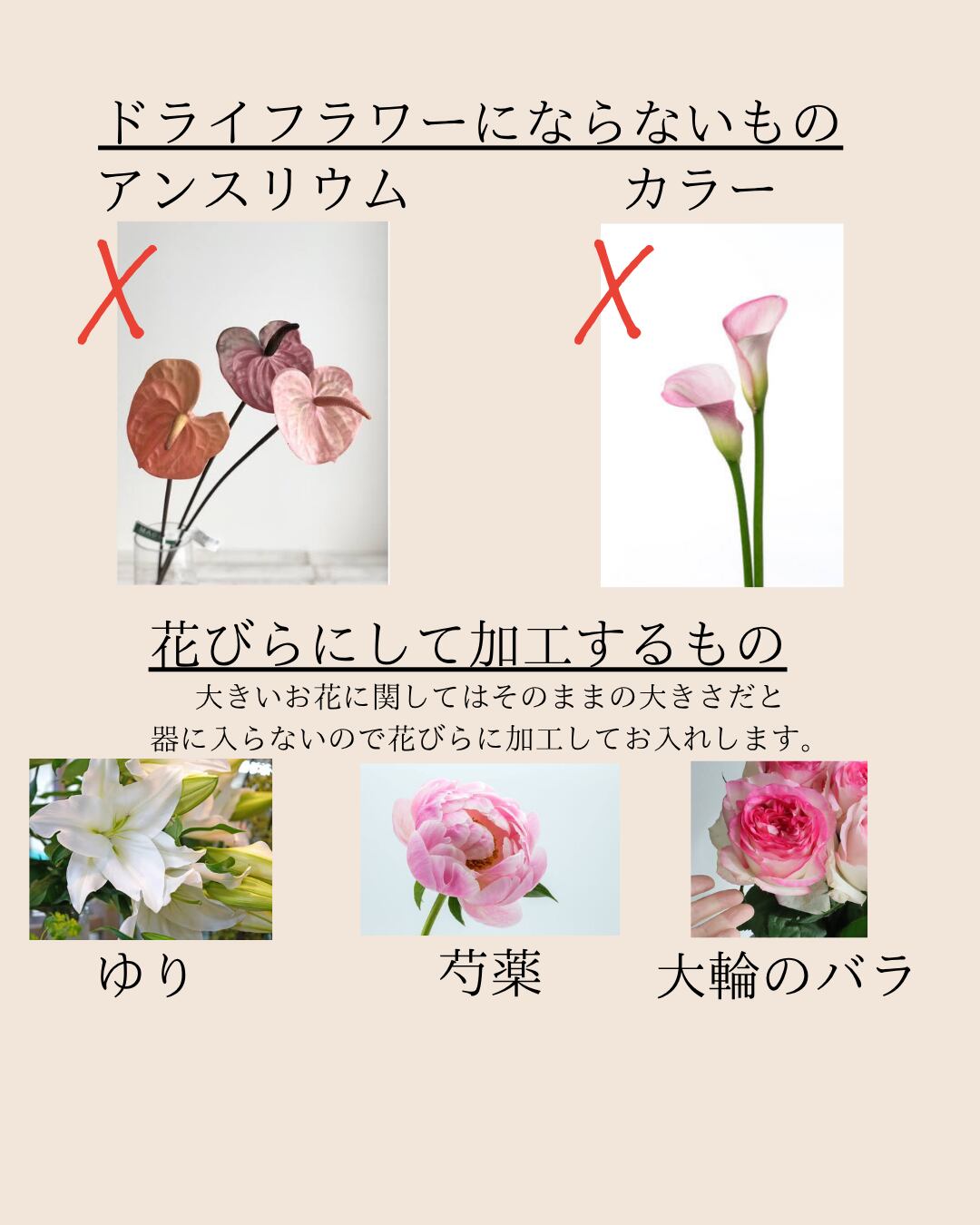 ・ドライフラワーに加工すると生花と異なる色合いになる場合もございます。あらかじめご了承ください。